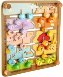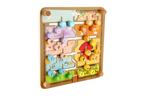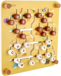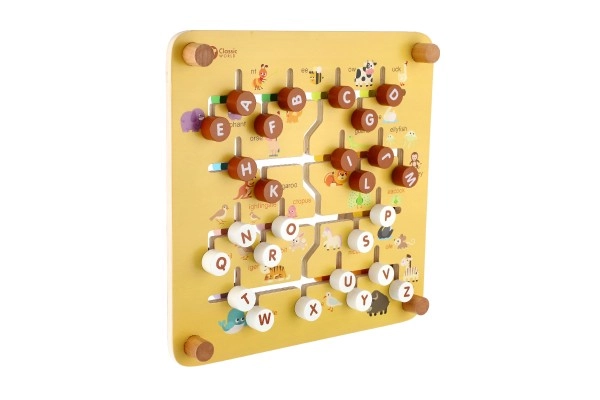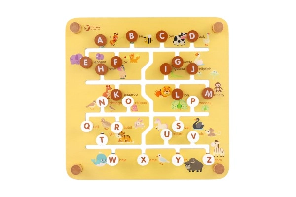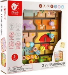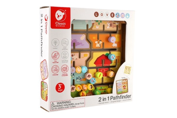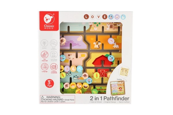 Divpusējais koka labirints 2 vienā no CLASSIC WORLD apvieno spēli un mācīšanos: vienā pusē ir ferma ar dzīvniekiem, otrā pusē alfabēts ar dzīvniekiem. Bērni trenē sīko motoriku, loģisko domāšanu un koncentrēšanos, virzot tapas pa labirintu uz pareizajām vietām. Kvalitatīvs koka izpildījums, izmērs 30 × 30 cm, piemērots no 3 gadu vecuma.