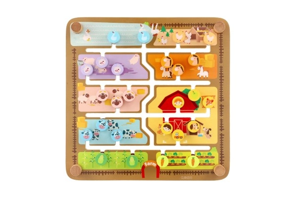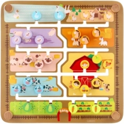 Gudrs un aizraujošs palīgs pirmsskolniekiem: divpusējā plāksne slēpj divas pasaules. Fermā bērni pārvieto tapas ar dzīvniekiem, sejiņām un augļiem pa izfrēzētām takām uz to vietām. Apgriežot plāksni, tā pārtop par alfabēta labirintu – uzdevums ir novest tapu ar sākumburtu līdz pareizajam dzīvniekam (nosaukumi angļu valodā), tāpēc rotaļīgi tiek trenēti burti un vārdu krājums.