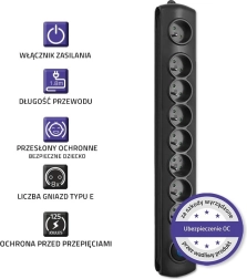 Meklējat universālu risinājumu vairāku ierīču barošanai no vienas rozetes? Šī pārsprieguma sloksne apvieno drošību, ergonomiku un dizainu. Pateicoties 8 kontaktligzdām, viegli pievienosiet TV, datoru, lādētājus un virtuves ierīces, bet 1,8 m kabelis nodrošina pietiekamu garumu.