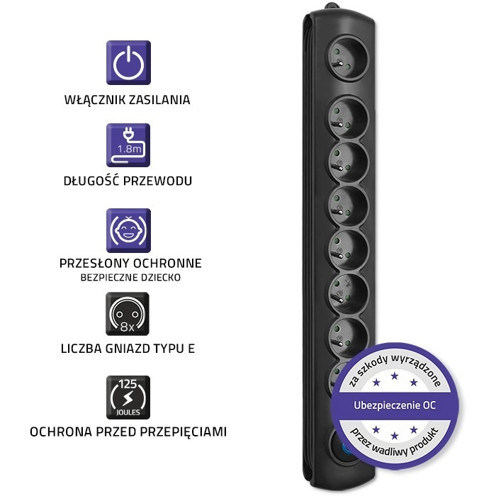 Drošība ir pirmajā vietā: iebūvētā pārsprieguma aizsardzība (varistors) sargā ierīces no sprieguma pīķiem, bērnu drošības slēžņi katrā kontaktligzdā novērš nejaušu saskari, bet neuzliesmojošais PP materiāls palielina drošību ikdienas lietošanā mājās, birojā un darbnīcā.