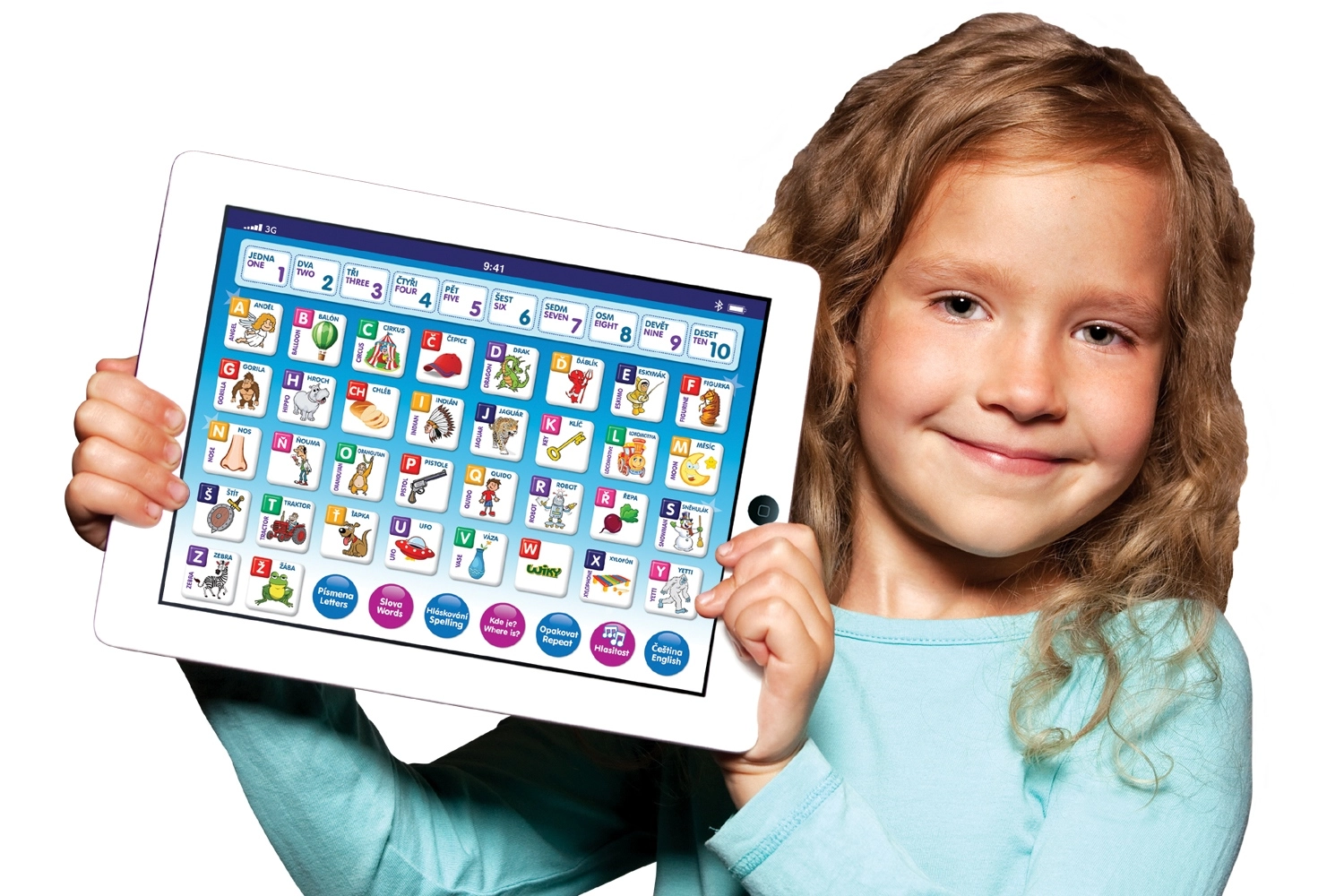 - Skaitīšana 1–10, alfabēts, burtu savienošana, spēles ar burtiem/vārdiem/cipariem, melodijas