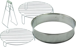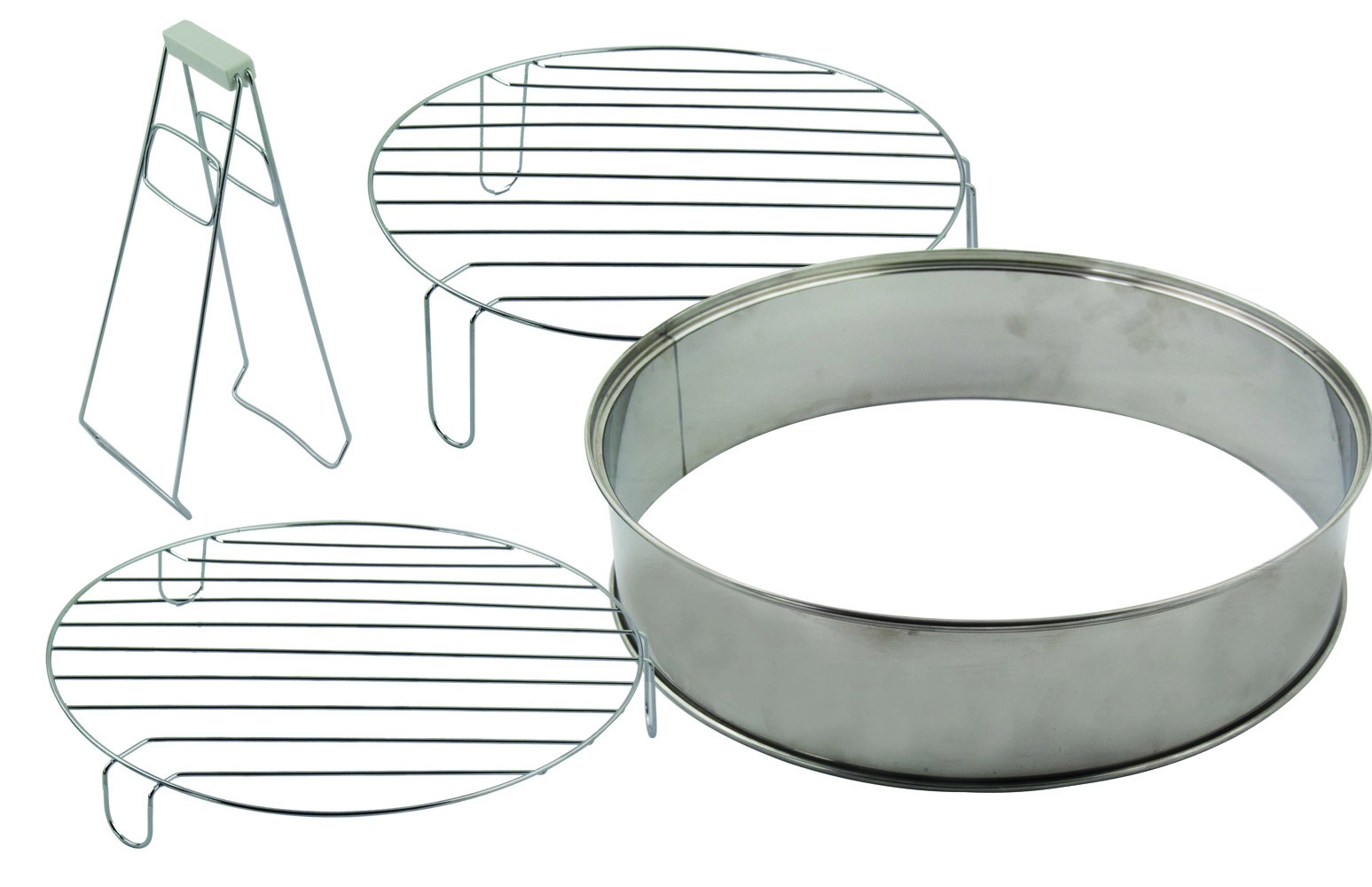 Iepakojumā atradīsiet restes dažādos augstumos, noteces paplāti un ērtu pacēlāju. Paplašināšanas gredzens pievieno vēl 6 litrus tilpuma, tādēļ varēsiet izcept arī lielākus gaļas gabalus vai veselu vistas cepeti.