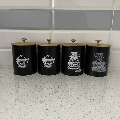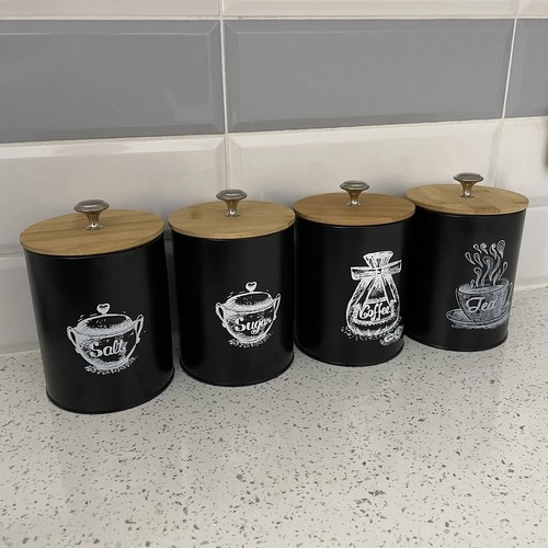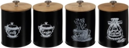 Komplektā ietilpst četras kārbas ar uzrakstiem “Sāls”, “Cukurs”, “Tēja” un “Kafija”, kas palīdz uzturēt saturu organizētu un viegli pieejamu. Pateicoties metāla rokturim uz vāka, kārbu atvēršana un aizvēršana ir vienkārša un ērta.