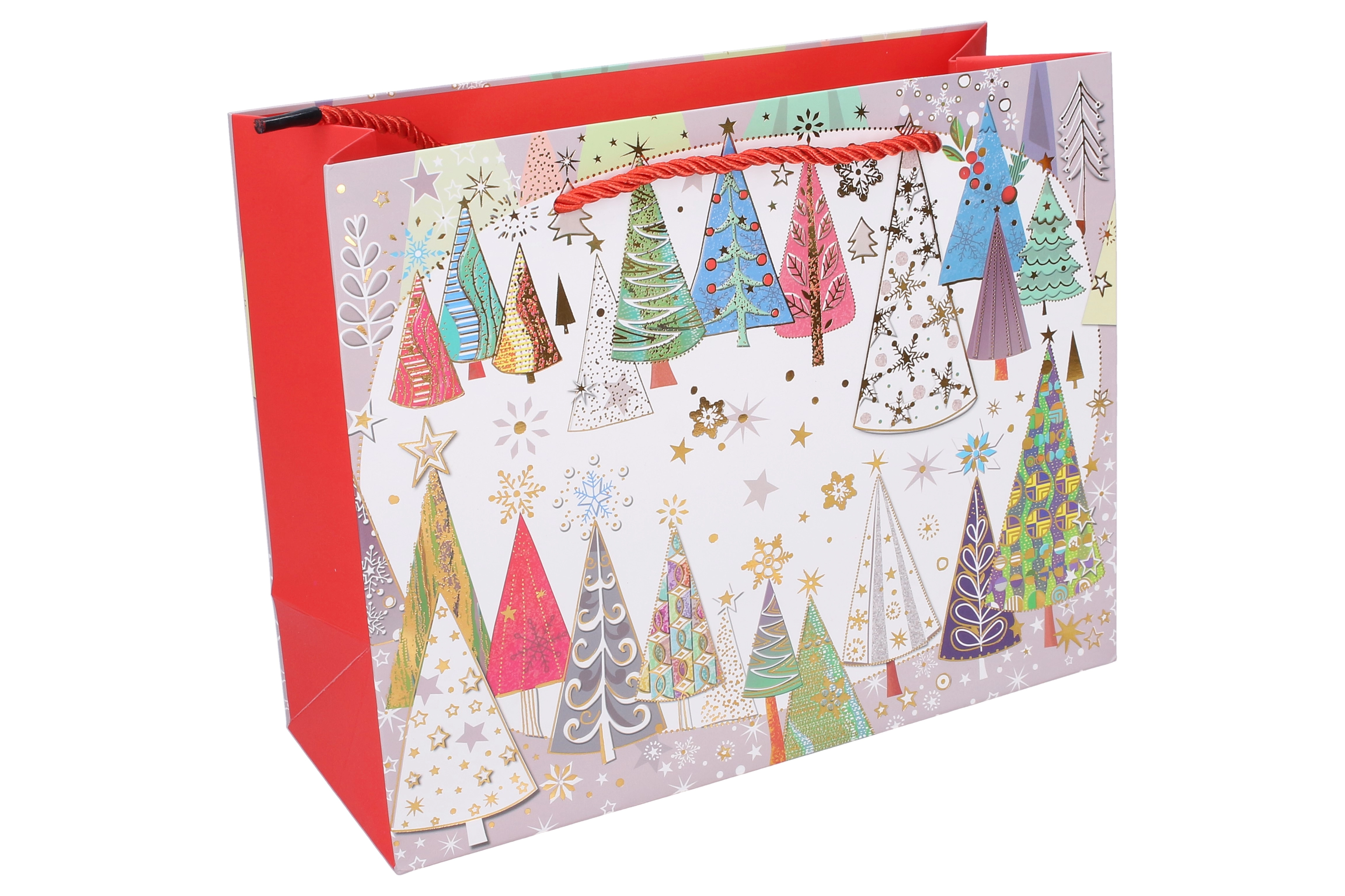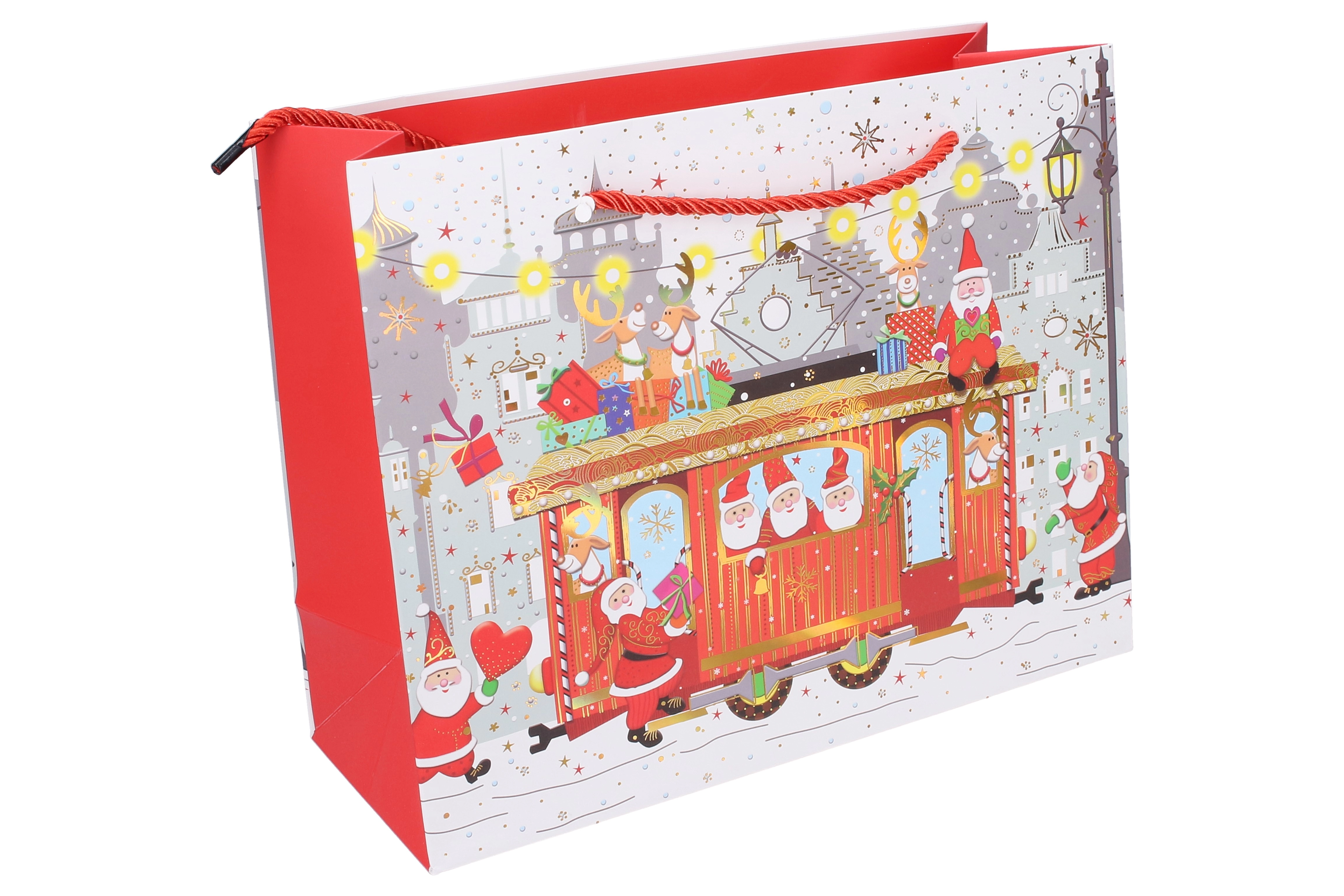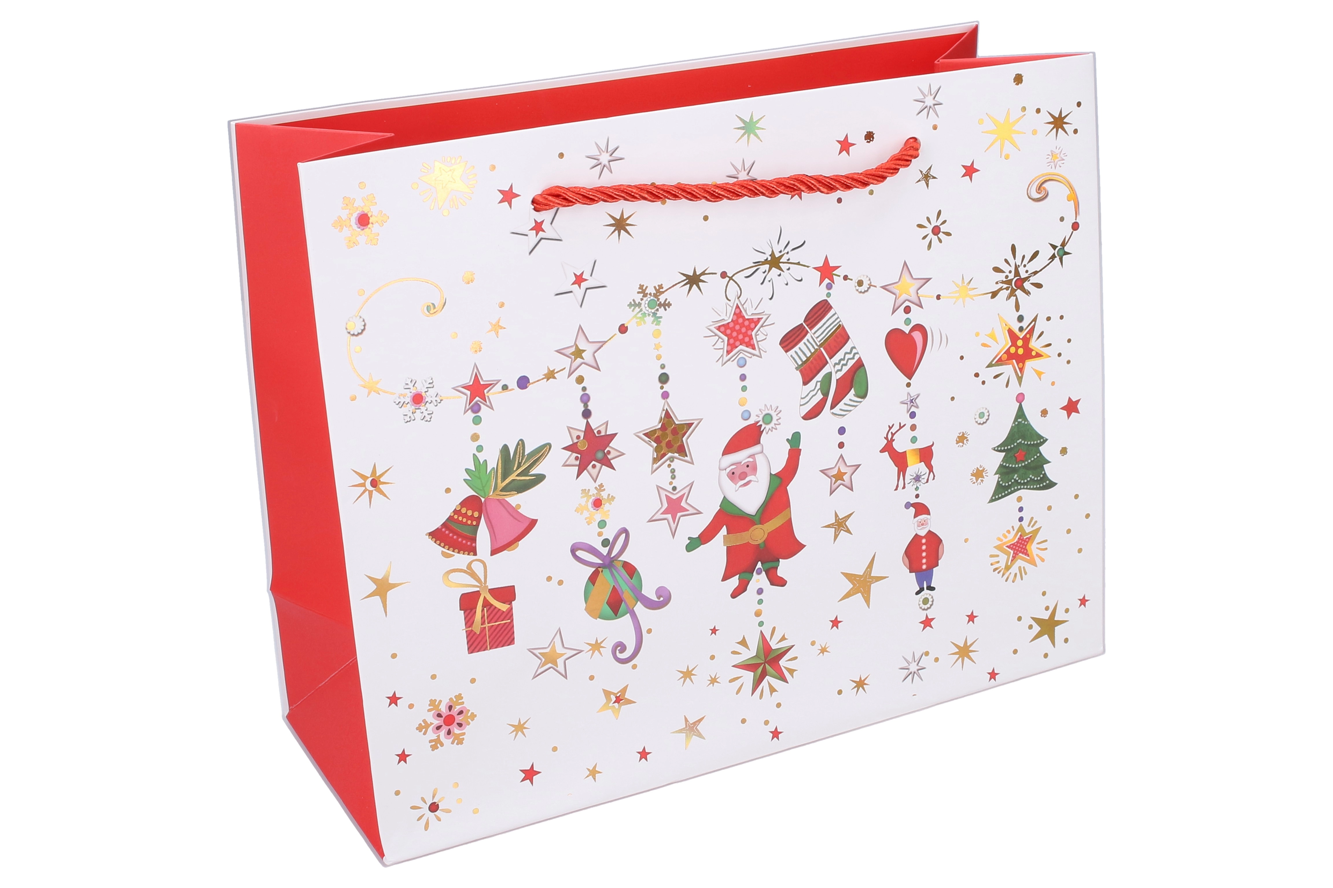 Šis ziemassvētku dāvanu maisiņš ir lieliska izvēle elegantai un ātrai dāvanu iesaiņošanai. Izmēri 24,5 × 19,5 × 9,5 cm padara to par praktisku izmēru mazākiem priekšmetiem, svecēm, aksesuāriem vai kosmētikas komplektiem. Četri atšķirīgi svētku motīvi piešķir katrai dāvanai unikālu izskatu.