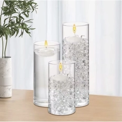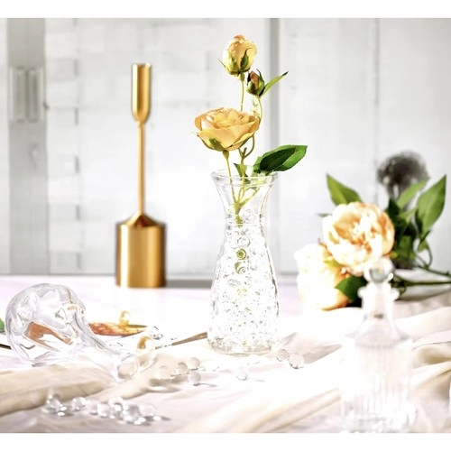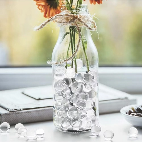Caurspīdīgās pērles piešķir kompozīcijām tīru, modernu izskatu un stabilizē ziedu kātus, kā arī sveces stikla traukos.