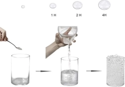 Pievienojot ūdeni, pērles dažu stundu laikā ievērojami uzbriest līdz aptuveni 11 mm un ir gatavas lietošanai.