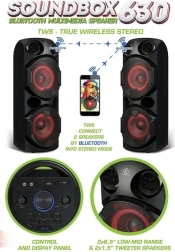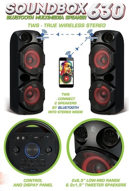 - Režīmi: Bluetooth, TWS, FM radio, USB zibatmiņa, microSD karte, AUX, Microphone IN
