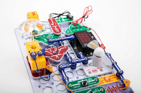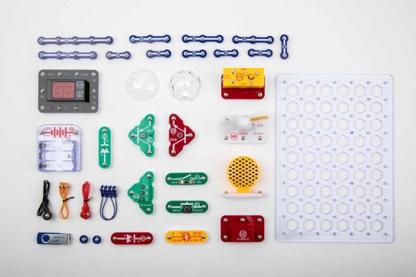 - 1× plate, 35× detaļas (piem., lidmašīna, mini auto, skaļrunis, kustības detektors, motors ar pārnesumkārbu), 1× rokasgrāmata (lejupielādei tiešsaistē)