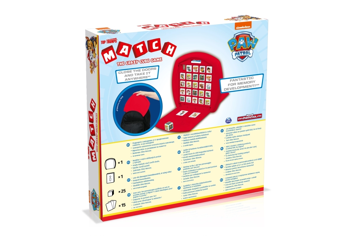Ģimenes spēle Match ar PAW PATROL varoņiem piedāvā ātru, spraigu un strategisku izklaidi diviem spēlētājiem. Mērķis ir salikt 5 vienādus simbolus rindā – horizontāli, vertikāli vai diagonāli – ātrāk nekā pretinieks. Vienkārši noteikumi, loģikas, atmiņas un koncentrēšanās treniņš un kompakts ceļojumu izpildījums padara šo spēli par ideālu izvēli bērniem un vecākiem.