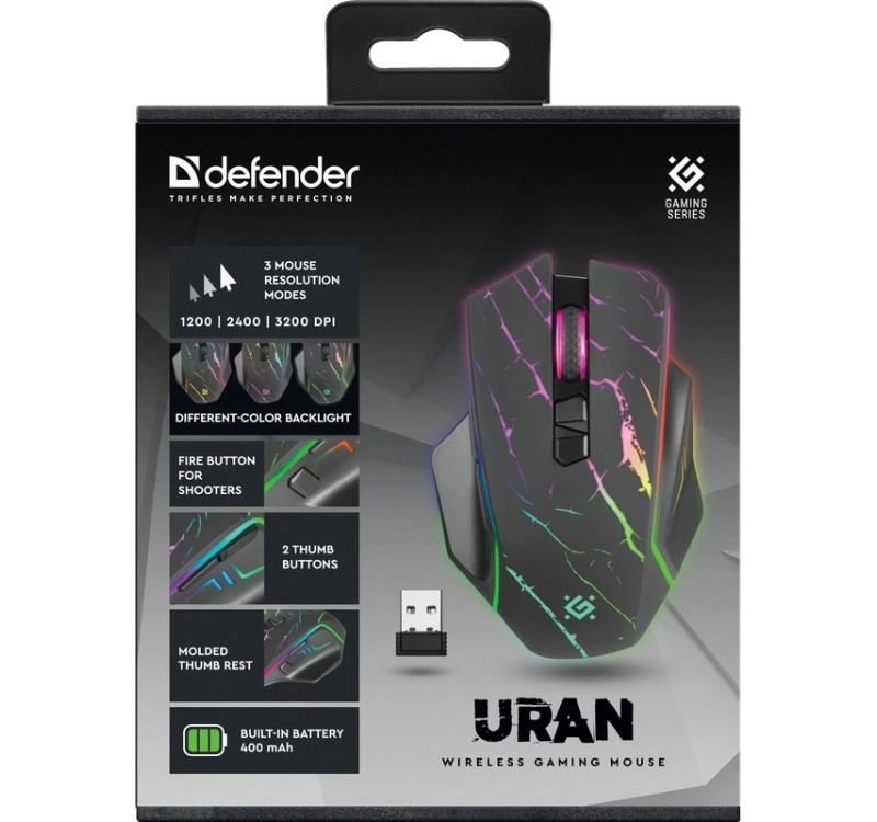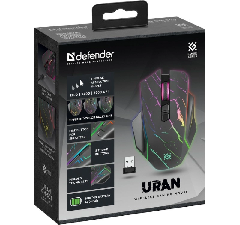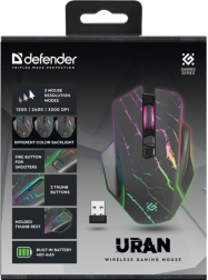 Bezvadu spēļu pele Defender Uran GM-503 piedāvā precīzu vadību ar līdz 3200 DPI, ērtu ergonomisku formu un RGB apgaismojumu ar plaisājošas virsmas efektu. Pateicoties 8 programmējamām pogām un uzticamam bezvadu savienojumam, tā ir lieliska izvēle spēlētājiem, kuri meklē veiktspēju, stilu un brīvību bez kabeļiem.