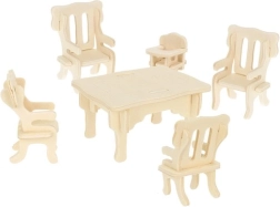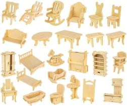 Šajā komplektā ir 34 koka mēbeļu detaļas, kuras varat salikt paši, izveidojot ideālu interjeru lellēm. Mēbeles ir veidotas mērogā, kas der dažādiem leļļu namiņiem, un, strādājot ar koku, bērni var attīstīt radošumu un veidot unikālas krāsu kombinācijas pēc savas gaumes.