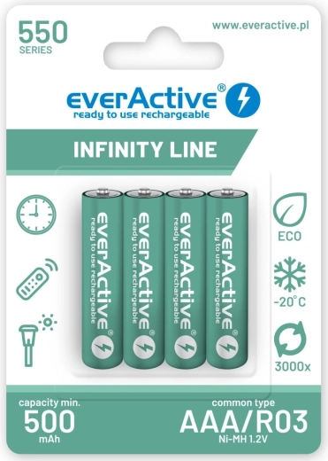 Komplekts ar 4 AAA R03 akumulatoriem ar ietilpību 550 mAh un tehnoloģiju gatavi lietošanai tūlītējai izmantošanai. Sērija Infinity Line ir ideāli piemērota saules lampām, bezvadu telefoniem un citām ierīcēm ar zemu līdz vidēju patēriņu, kur lieliski aizstāj vienreizlietojamās baterijas un nodrošina ekonomiju un ekoloģisku ieguvumu.