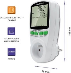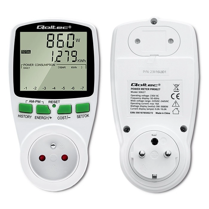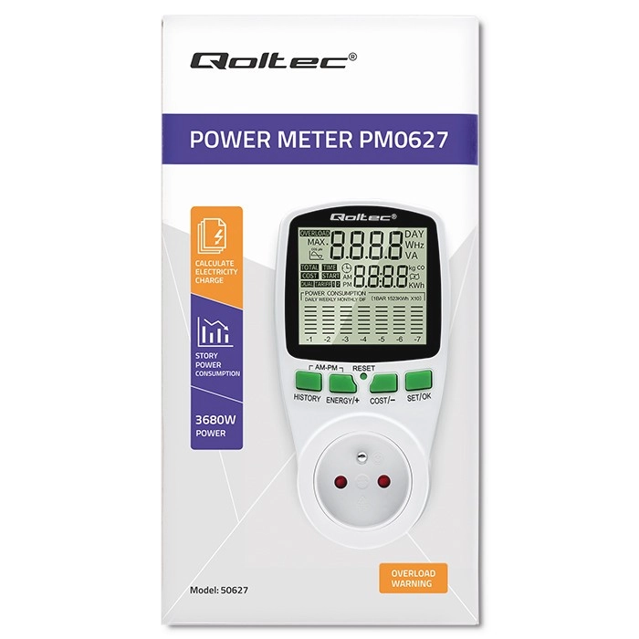 Iegūstiet skaidrību, kuras ierīces ir lielākie enerģijas “rijēji”. Qoltec PM0627 nodrošina precīzu mērīšanu bez minējumiem, lai jūs varētu uzticami aprēķināt izmaksas un novērtēt ietaupījumu efektivitāti. Pateicoties apgaismotajam LCD, jūs viegli pārbaudīsiet aktuālo jaudu, kWh summu, laiku un cenu pēc ievadītās tarifas.