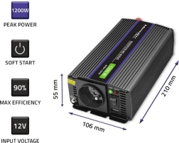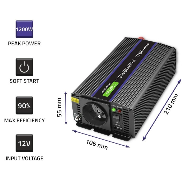 Robusts, bet viegls alumīnija korpuss iztur vibrācijas un mehānisku slodzi. Integrētā ES ligzda, USB ports un automātiskais ventilators paaugstina lietošanas komfortu. Pārveidotājs ir ideāls karavāniem, piekabēm, laivām un jahtām, kā arī noder kā neatliekamais barošanas avots (UPS) īslaicīgai RTV un biroja tehnikas darbības uzturēšanai elektroapgādes pārrāvumu laikā.
