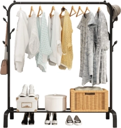 Uzturiet mājās kārtību ar praktisku brīvi stāvošu apģērbu pakaramo ar apakšējo plauktu apaviem. Izturīga tērauda konstrukcija melnā krāsā apvieno izturību, stabilitāti un mūsdienīgu izskatu. Pateicoties ietilpīgajai pakaramo stangai un apakšējam plauktam, jūs viegli nodrošināsiet pārskatāmu organizāciju priekšnamā, guļamistabā vai birojā.
