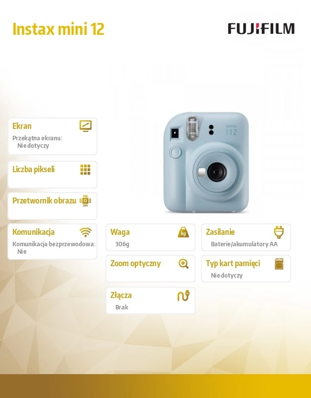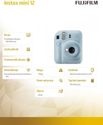 Instax Mini 12 kamera ir veidota tā, lai katrs mirklis, ko uztverat ar objektīvu, varētu tikt izdrukāts uzreiz. Tās kompaktajā dizainā ir jaudīga zibspuldze un ievilkams objektīvs, kas ļauj uzņemt lieliskus kadrus dažādos apgaismojuma apstākļos.