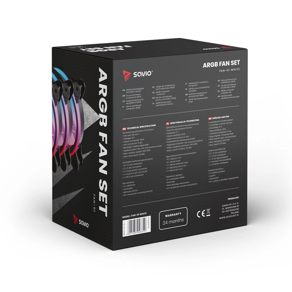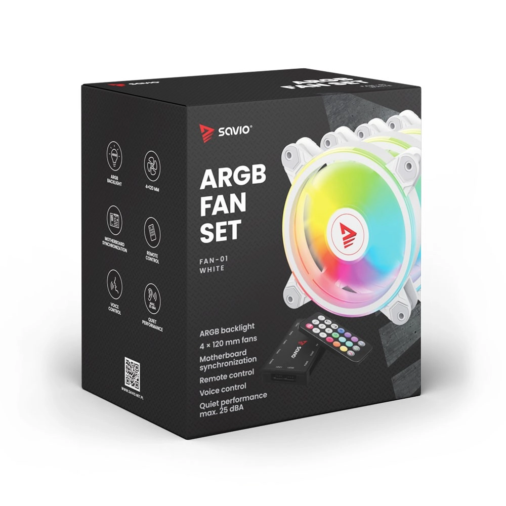Savio četru ventilatoru komplekts nodrošina jaudīgu dzesēšanu un iespaidīgu ARGB apgaismojumu jūsu datoram. Iepakojumā iekļauts kontrolieris un tālvadības pults, kas ļauj viegli pielāgot gaismas efektus un ventilatoru ātrumu.