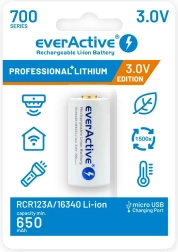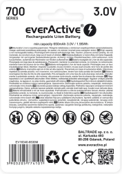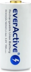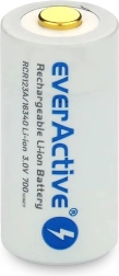 Inovatīvais uzlādējamais akumulators EverActive 16340 ar 700 mAh ietilpību ir lieliska izvēle jebkurai elektroniskai ierīcei. Šis Li-ion akumulators izceļas ar īpašu 3 V sprieguma versiju, kas to padara par tiešu CR123 bateriju aizstājēju. Tā konstrukcijā ir elektroniskā PCM aizsardzība, kas pasargā no pārlādes, dziļas izlādes un īssavienojuma.