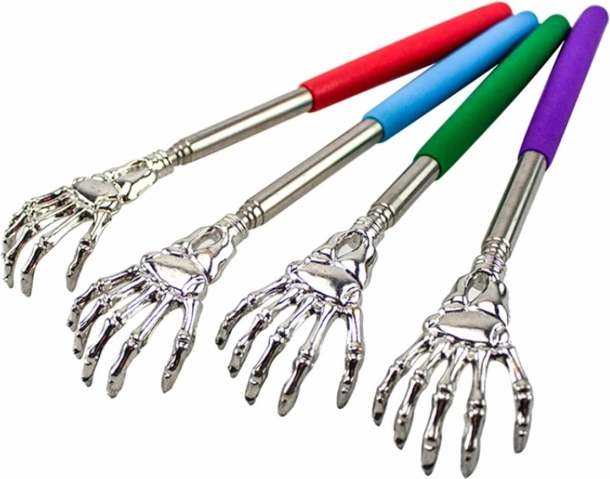 Praktiska teleskopiska muguras skrāpējamā roka ar skeleta rokas motīvu ātrai atvieglošanai no niezes jebkurā laikā un vietā. Pateicoties metāla izpildījumam un ērtajam putu rokturim, lietošana ir vienkārša un droša. Kompakts izmērs, regulējams garums 21–56 cm un izturīgs nerūsējošais tērauds padara to par ideālu piederumu mājās, birojā un ceļā.