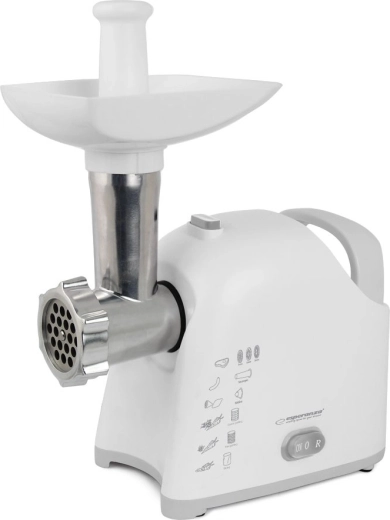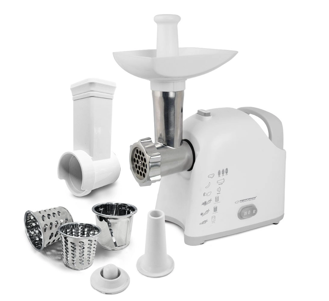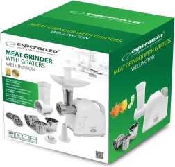 ESPERANZA Wellington ir mūsdienīgs un funkcionāls palīgs, kas apvieno gaļas mašīnu un rīvi vienā korpusā. Malšanas režīmā tas tiek galā ne tikai ar gaļu, bet arī ar citām sastāvdaļām, tostarp maisījumu sagatavošanu kotletēm vai pastētēm. Rīvēšanas režīms atvieglo augļu, dārzeņu, cietā siera, šokolādes vai riekstu griešanu un smalcināšanu – ideāli ātrai salātu, desertu un piedevu sagatavošanai.