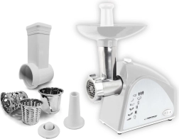 - Bagātīgs piederumu komplekts: 3 sieti (3/5/7 mm), 3 rīvēšanas cilindri, uzgalis desām un kebbe.