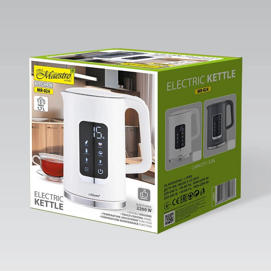 Elektriskajai tējkannai Maestro ir skārienjutīgs vadības panelis ar temperatūras iestatīšanas iespējām, kas ļauj precīzi pielāgot atbilstoši jūsu vajadzībām: