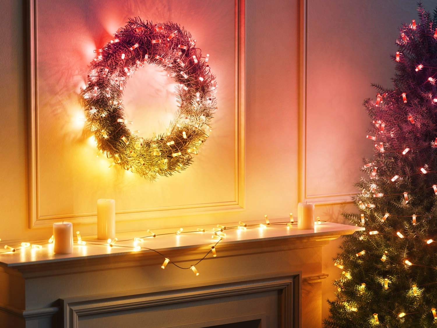 Izbaudiet elpu aizraujošus dekoratīvos efektus savās mājās ar izgaismotu Ziemassvētku vainagu un eglīti ar gaismiņu virtenēm.