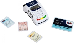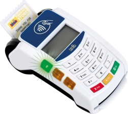 Komplektā ietilpst terminālis, maksājumu karte un 3 čeki – gatavs tūlītējai spēlei bez papildu piederumiem.