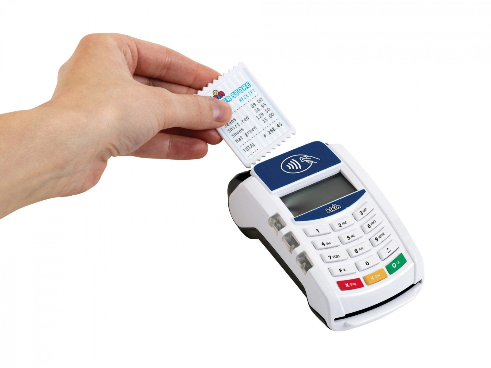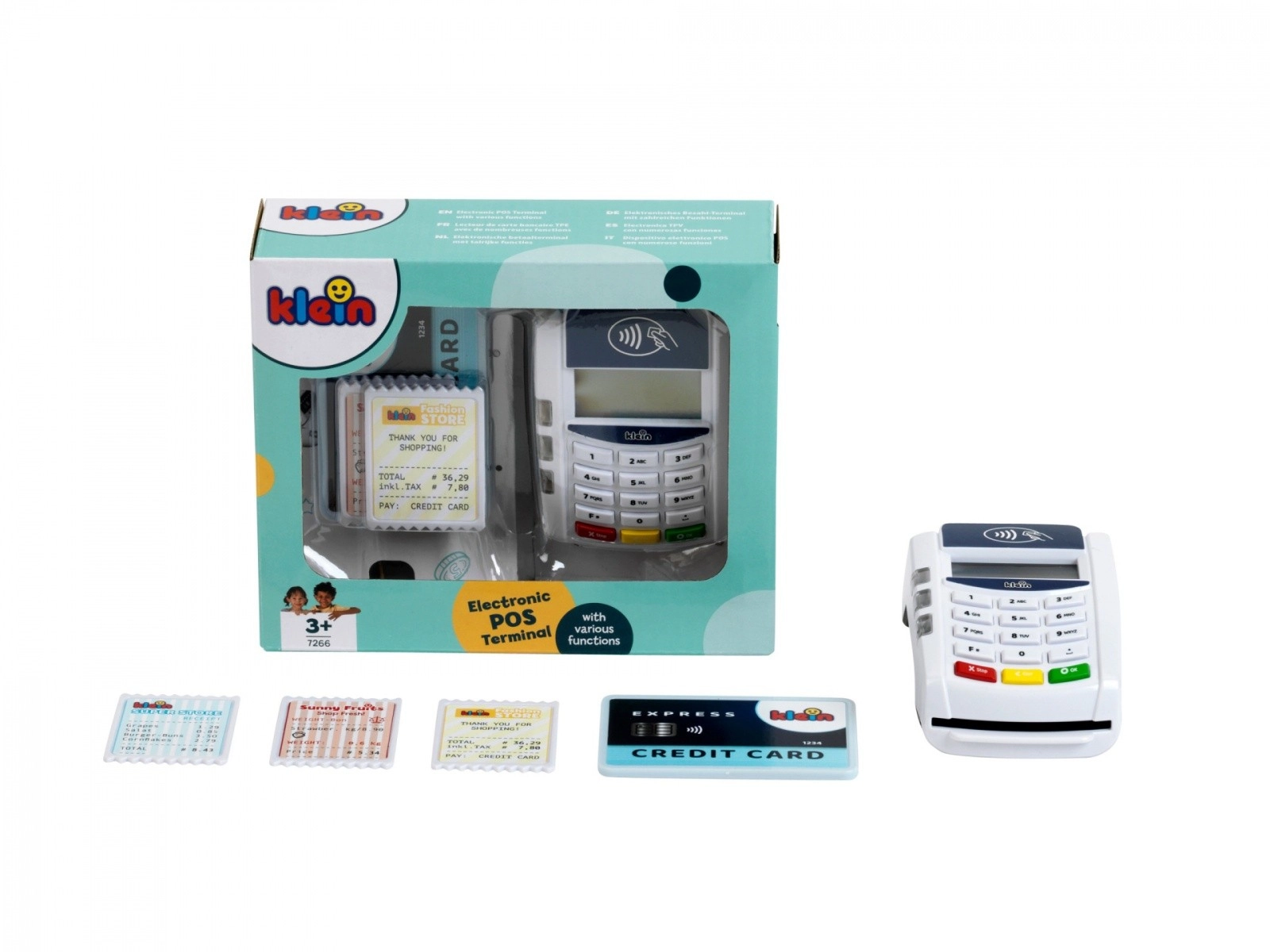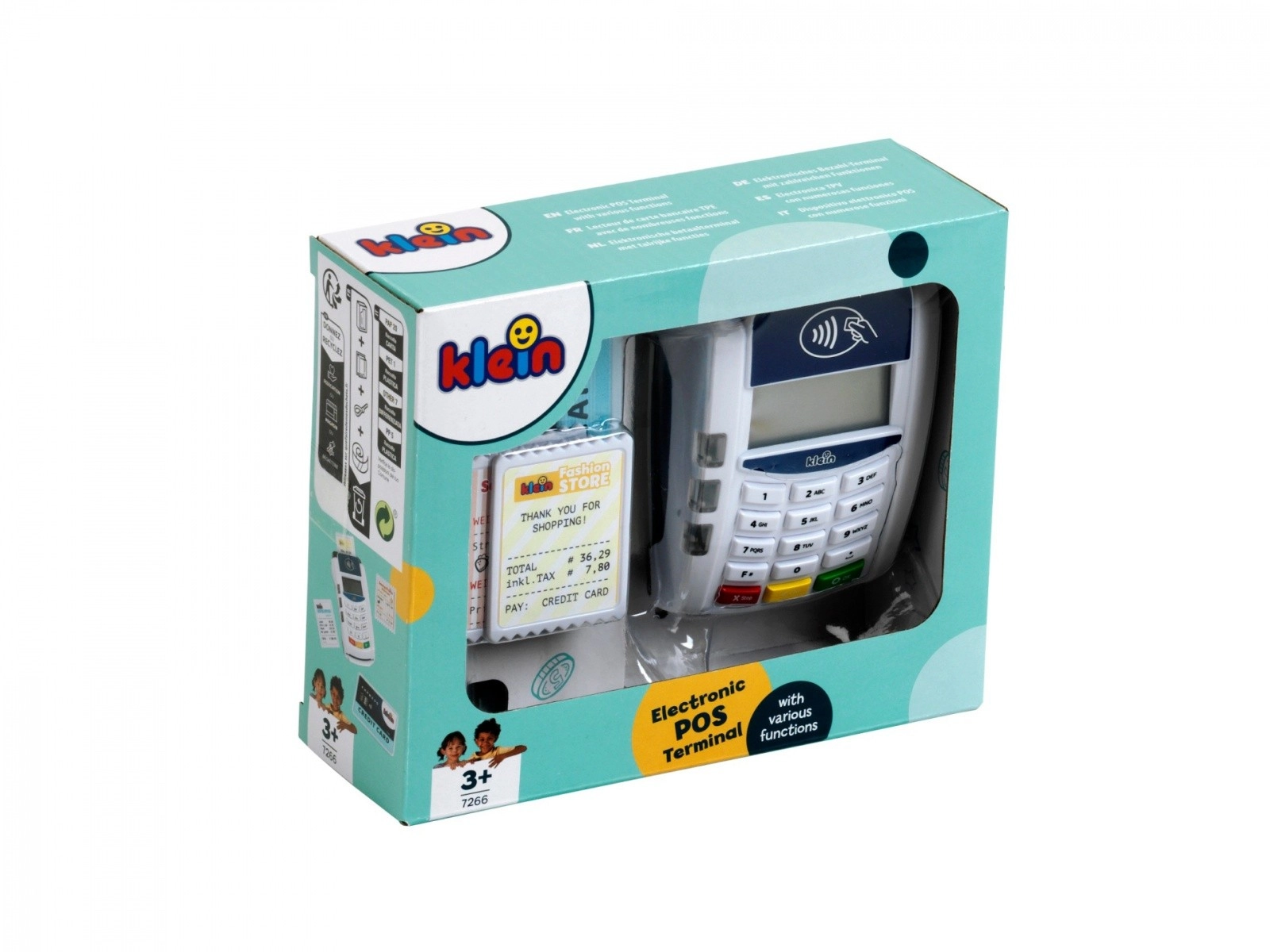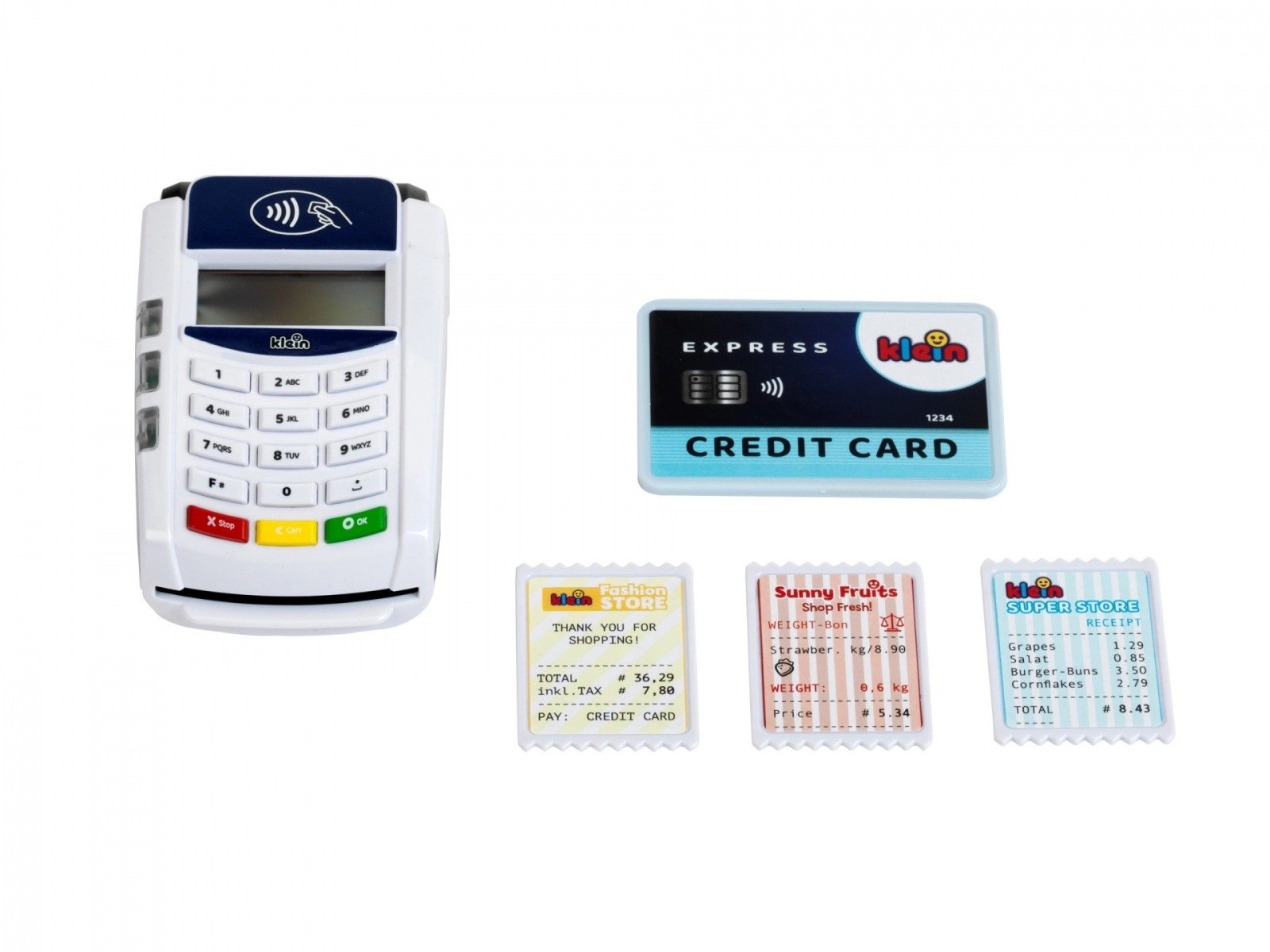 Interaktīvais bērnu POS maksājumu terminālis no zīmola KLEIN pārvērš veikala spēli reālistiskā pieredzē. Tas piedāvā bezskaidras naudas (bezkontakta) maksājumus, gaismas un skaņas efektus, kā arī ietver maksājumu karti un čekus. Lielisks veids, kā attīstīt iztēli, sociālās prasmes un izpratni par iepirkšanās pamatprincipiem.