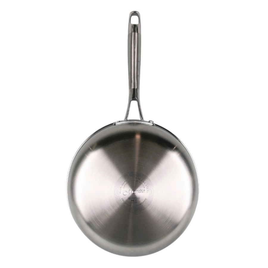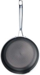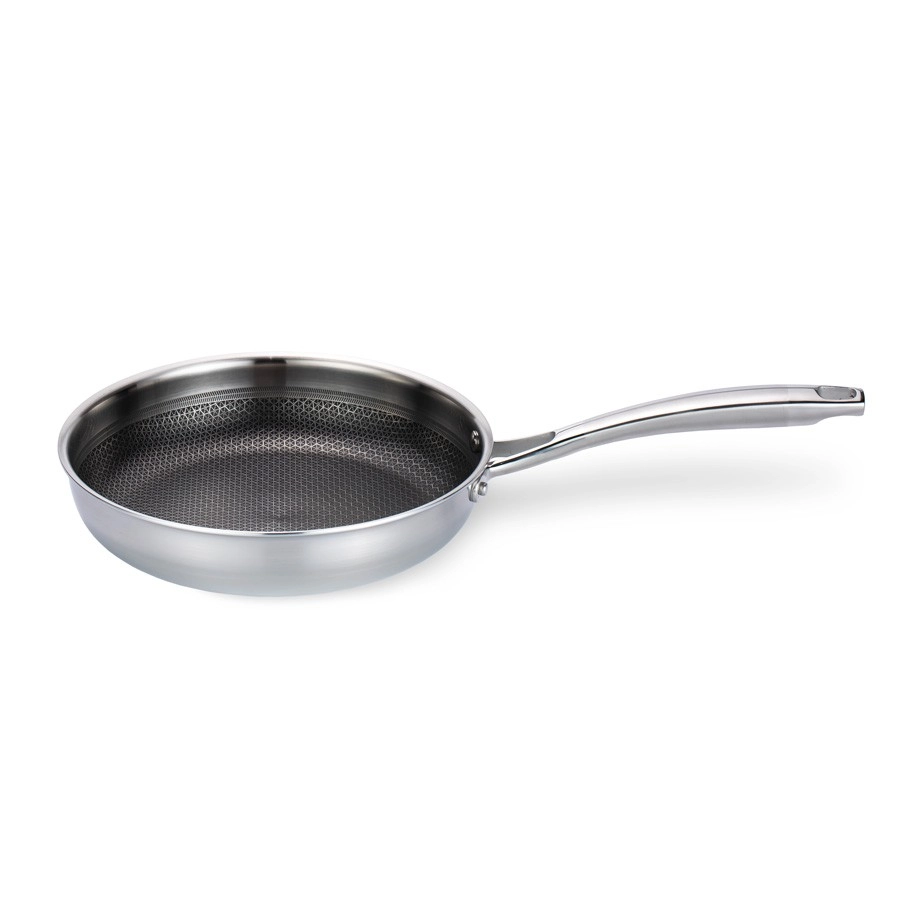 Robusta nerūsējošā tērauda panna ar 26 cm diametru ir veidota precīziem rezultātiem un ilgam kalpošanas laikam. Trīsslāņu “sviestmaižu” pamatne apvieno ārējo magnētisko nerūsējošo tēraudu 430, alumīnija kodolu perfektai siltuma vadīšanai un iekšējo pārtikas klases nerūsējošo tēraudu 304. Teksturēta virsma ar heksagonālu “šūnveida” rakstu palielina izturību pret skrāpējumiem un veicina nepiedegšanu.