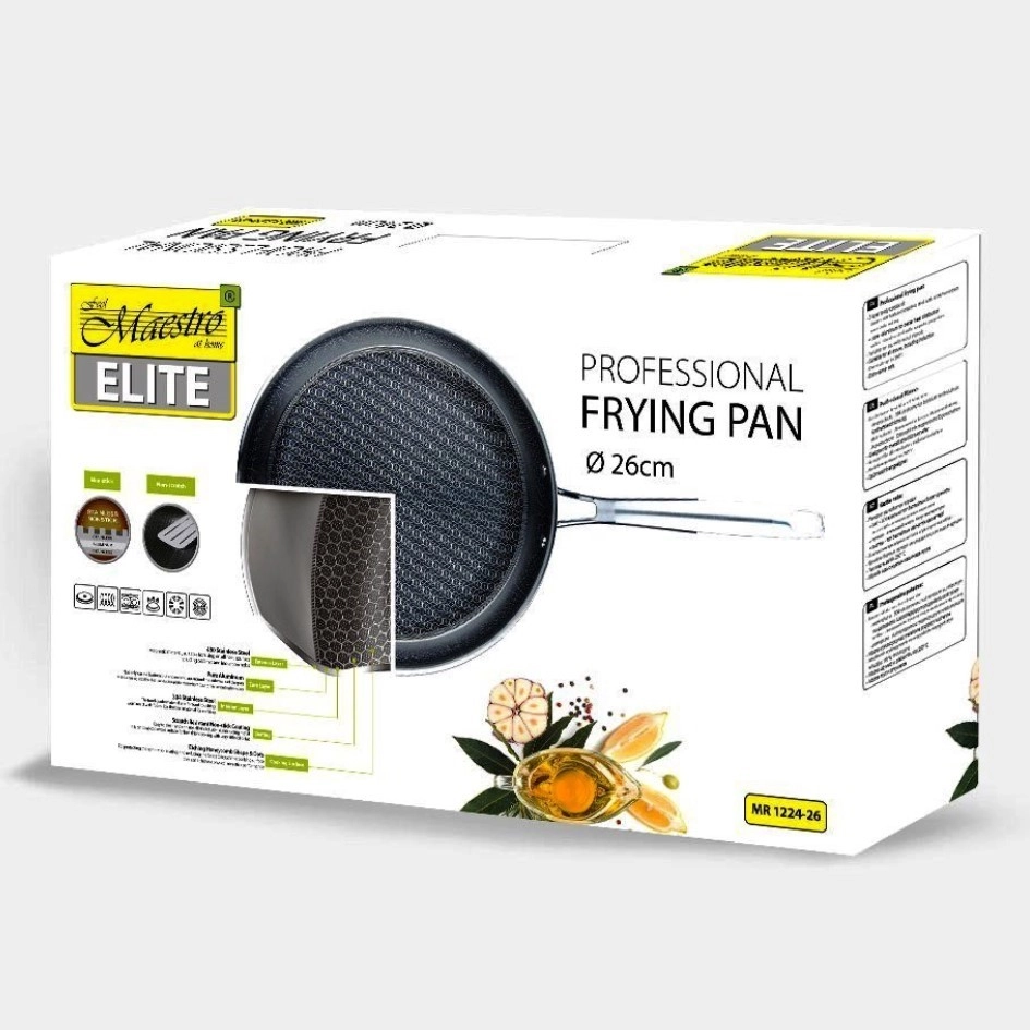 Profesionāla nerūsējošā tērauda panna MAESTRO ar diametru 26 cm piedāvā ātru un vienmērīgu uzsildīšanu, izturīgu trīsslāņu korpusu un nepiedegošu virsmu ar šūnveida tekstūru ikdienas gatavošanai mājās un gastronomijā. Tā ir piemērota visiem plīšu veidiem, tostarp indukcijai, droša cepeškrāsnī līdz 260 °C un mazgājama trauku mazgājamajā mašīnā.