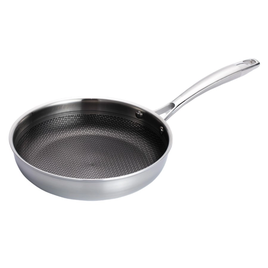 Atklājiet uzticamu pannu ikdienas un profesionālai gatavošanai. Trīsslāņu korpuss no nerūsējošā tērauda 430, alumīnija kodola un pārtikas klases nerūsējošā tērauda 304 nodrošina ātru uzsilšanu un ilgstošu temperatūras noturību. Sešstūra virsmas tekstūra pasargā pannu no skrāpējumiem un vienlaikus veicina vieglu ēdienu atdalīšanu.