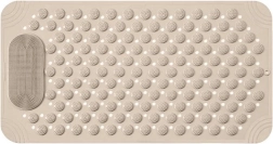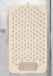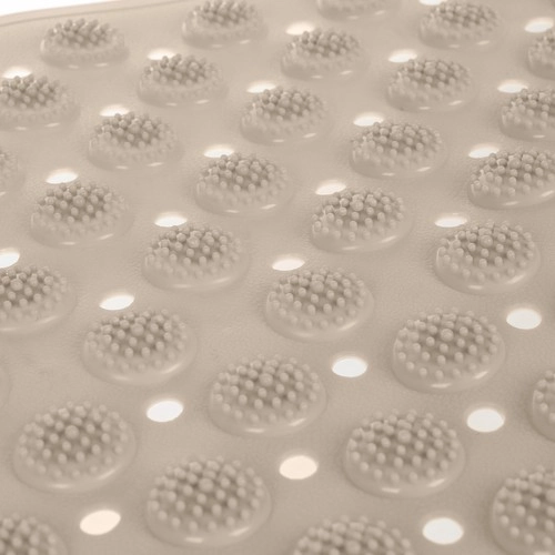 RUHHY paklājiņš apvieno pretslīdes aizsardzību ar relaksējošu pēdu masāžu. Blīvs piesūcekņu tīkls stingri turas pie gludas virsmas, bet teksturēta virsma ar izciļņiem maigi masē pēdas un palielina komfortu ikdienas higiēnas laikā.