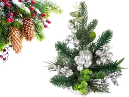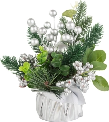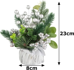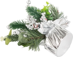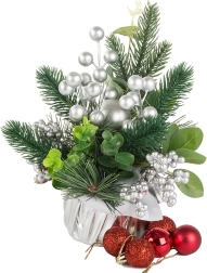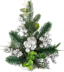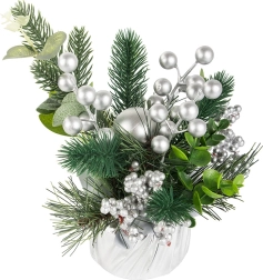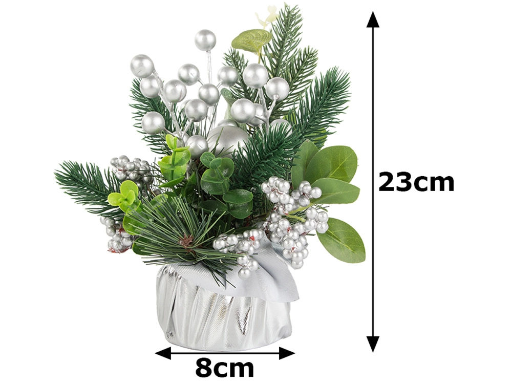 Izbaudiet svētku atmosfēru ar šo skaisto Ziemassvētku dekorāciju, kas apvieno māksliniecisku izpildījumu un eleganci. Sudraba bumbas un rotājumi piešķir dekorācijai elegantu, ziemīgu izskatu, kas lieliski sader ar tradicionālajiem Ziemassvētku rotājumiem. Viss elements ir ietīts sudraba audumā, radot vienotu un stilīgu koptēlu.