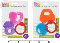 Komplektā ir divas košļājamās rotaļlietas un praktisks savienojošs gredzens, uz kura tās var uzvērts. Košļājamās rotaļlietas vienlaikus attīsta maņas un veicina acu–roku koordināciju kā arī rupjo motoriku. Izmērs 6–9 cm ir ideāls mazajiem bērniem un drošai pasaules izzināšanai ar muti.