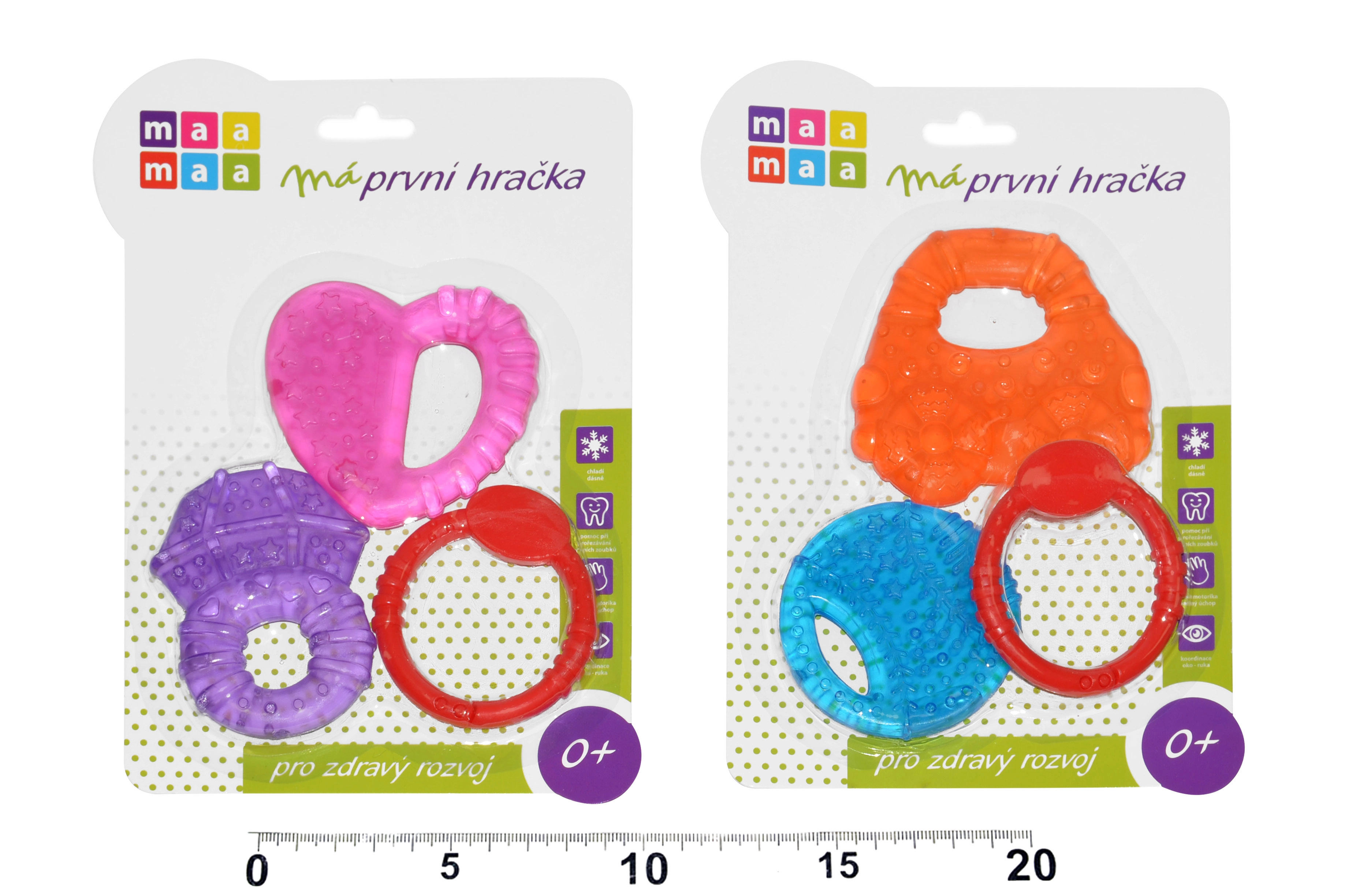 Praktisks aukstuma košļājamo rotaļlietu komplekts sniedz zīdaiņiem tūlītēju atvieglojumu zobu šķilšanās laikā. Košļājamās rotaļlietas ir izgatavotas no mīksta, droša materiāla, dažas piepildītas ar destilētu ūdeni vai gelu, lai pēc atdzesēšanas ledusskapī nodrošinātu patīkamu vēsumu. Ergonomiska forma atvieglo satvērienu, masē smaganas un stimulē bērnu vizuāli un taustes ceļā. Iepakojumā ietilpst 2 košļājamās rotaļlietas un savienojošs gredzens.