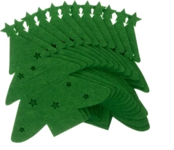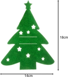 Piešķiriet svētku galdam burvību ar praktiskiem galda piederumu maciņiem eglītes formā. Komplektā ir 12 gabali no kvalitatīva, bieza filca koši zaļā krāsā. Pateicoties izturīgajam materiālam, tie saglabā formu, nekrokojas un krāsa neizbalē pat biežas lietošanas laikā. Universālais izmērs viegli ietilpina dakšiņu, nazi un karoti un lieliski papildina jebkuru Ziemassvētku galda klājumu.