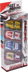Šis lieliskais komplekts piedāvā četras izturīgas un detalizēti izstrādātas sacīkšu mašīnītes, kuras pietiek atvilkt atpakaļ un palaist. Pateicoties kompaktajam 7 cm izmēram, tās lieliski der mājas sacensībām, šķēršļu trasēm un ceļošanai. Metāla izpildījums nodrošina ilgāku kalpošanu un izklaidi bez kompromisiem.