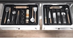 Pārskatāms dalījums gan galda piederumiem, gan virtuves rīkiem paātrina gatavošanu un uzlabo ikdienas darbu organizāciju virtuvē.