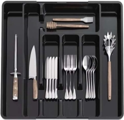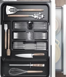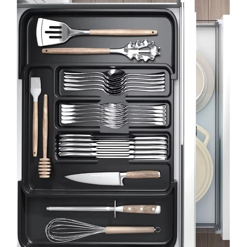 Maksimizējiet vietu atvilktnē, pateicoties gudram izvelkamam dizainam. Organizētāju var vienmērīgi pielāgot dažādiem atvilktņu platumiem, lai galda piederumi, naži un lāpstiņas vienmēr būtu pārskatāmi sakārtoti. Izturīgais PP izpildījums garantē ilgu kalpošanas laiku, noturību pret skrāpējumiem un vieglu kopšanu.