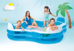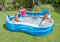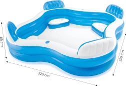 Ģimenes uzpūšamais baseins INTEX 229 × 229 cm ar 4 sēdvietām un atzveltnēm un 2 dzērienu turētājiem no izturīga PVC. Ērta sēdēšana, ātra iztukšošana un lieliska izklaide bērniem un pieaugušajiem.