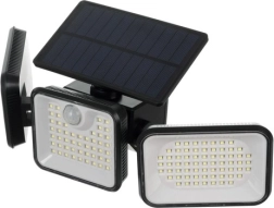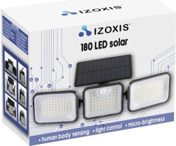 Jaudīgā IZOXIS saules lampa ar 180 LED, PIR kustības sensoru un krēslas sensoru uzticami izgaismo dārzu, ieeju, garāžu vai terasi. Tā piedāvā 550 lm spilgtumu, 3 regulējamus paneļus plašam pārklājumam līdz 300°, IP65 ūdensizturību un ilgstošu darbību līdz 8–10 h pēc pilnas uzlādes – bez elektrības rēķiniem.