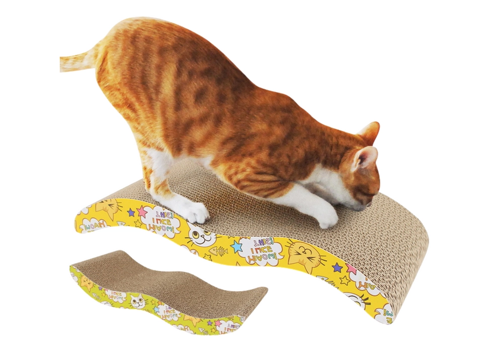 Cieta kartona tekstūra vilina skrāpēt, savukārt dzeltenais apdruku dizains ar kaķu motīviem atdzīvina jebkuru interjeru.