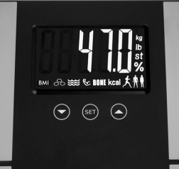 Vadība ir maksimāli vienkārša: poga SET un bultiņas vecuma (18–80 gadi), auguma (100–220 cm) un aktivitātes līmeņa 1–5 ievadei, profila izvēle sieviete/vīrietis/sportists un ērtā mērvienību pārslēgšana kg/lb/st ar UNIT pogu apakšpusē. Pēc mērījuma svari automātiski izslēdzas pēc 60 s, taupot bateriju un vienmēr paliek gatavi nākamajai lietošanai.