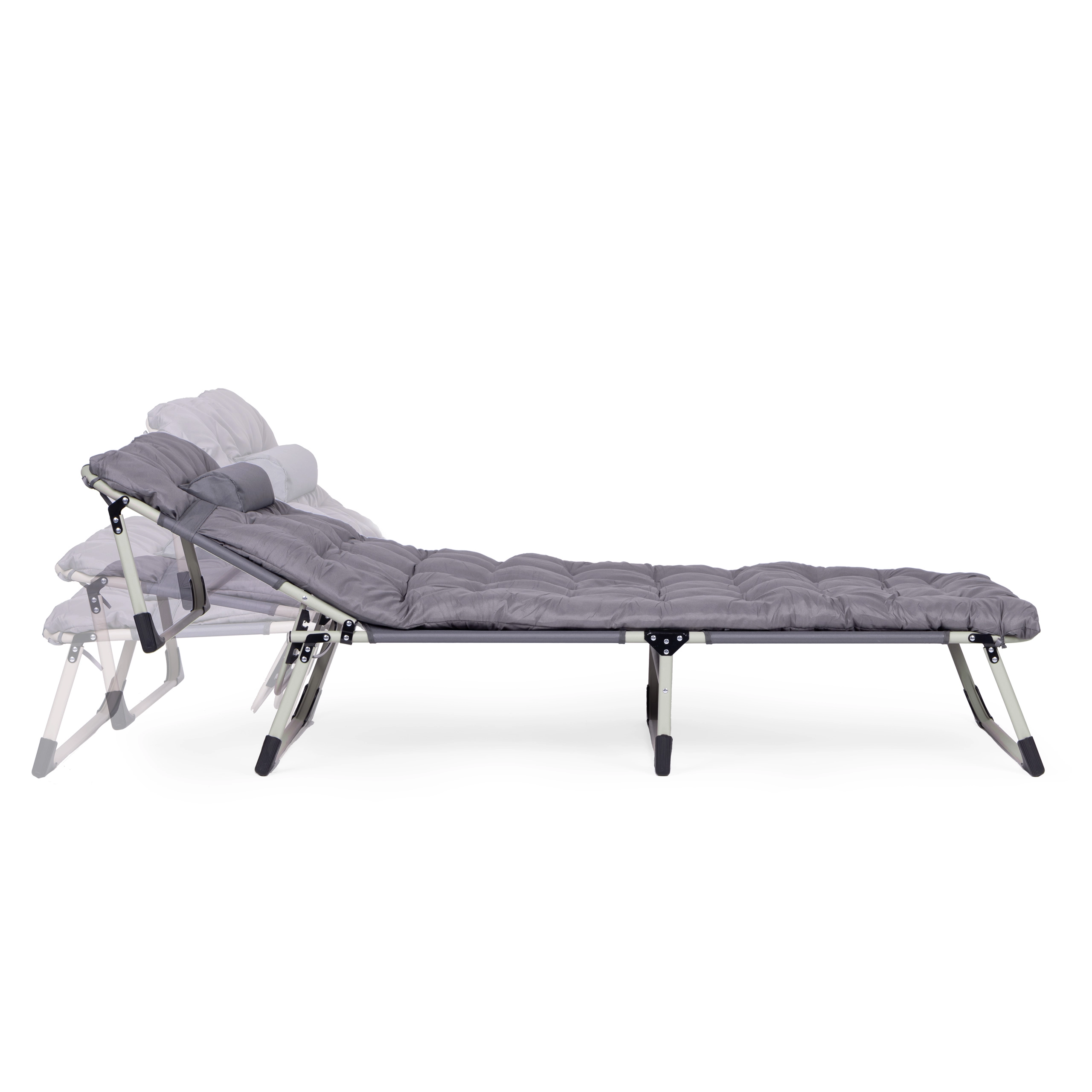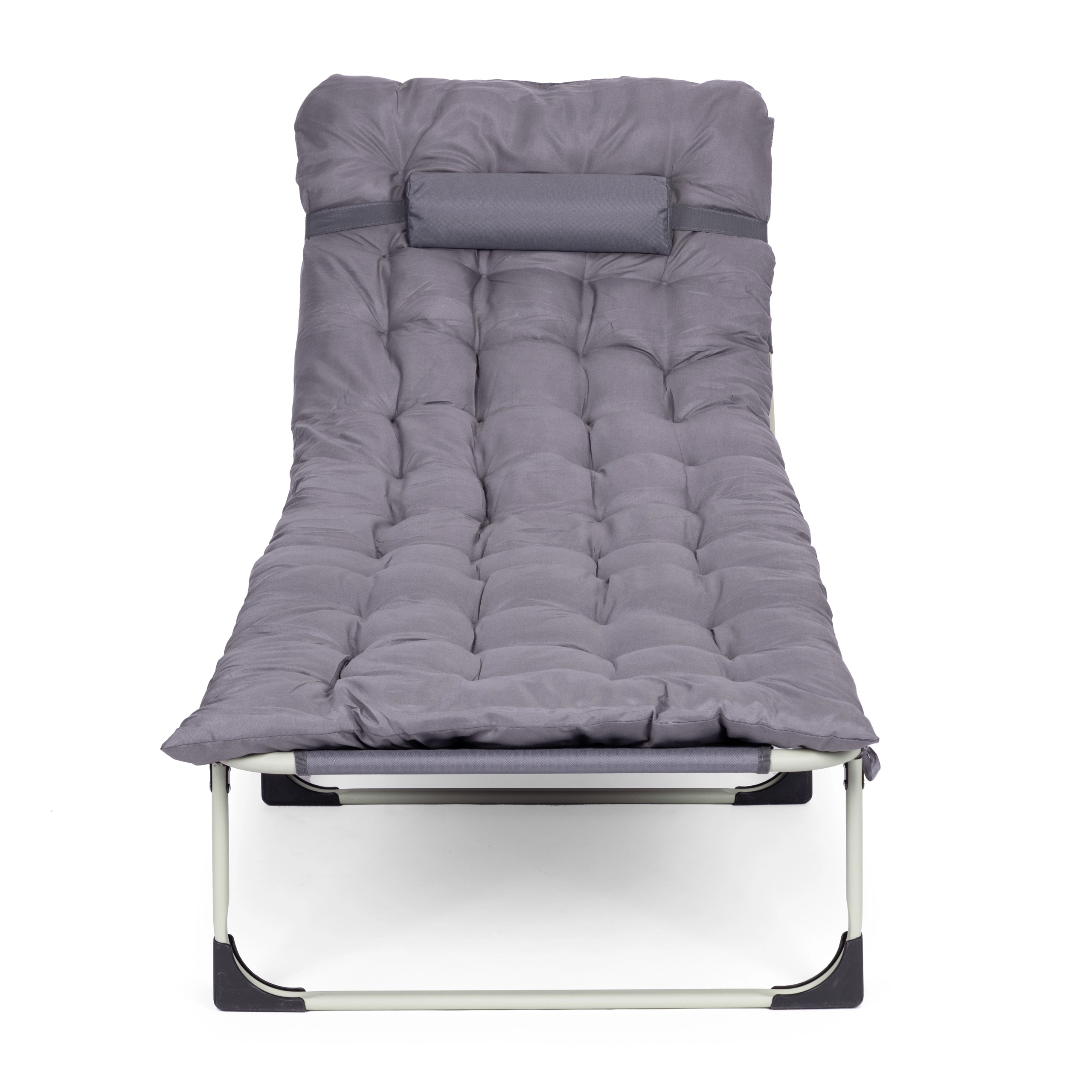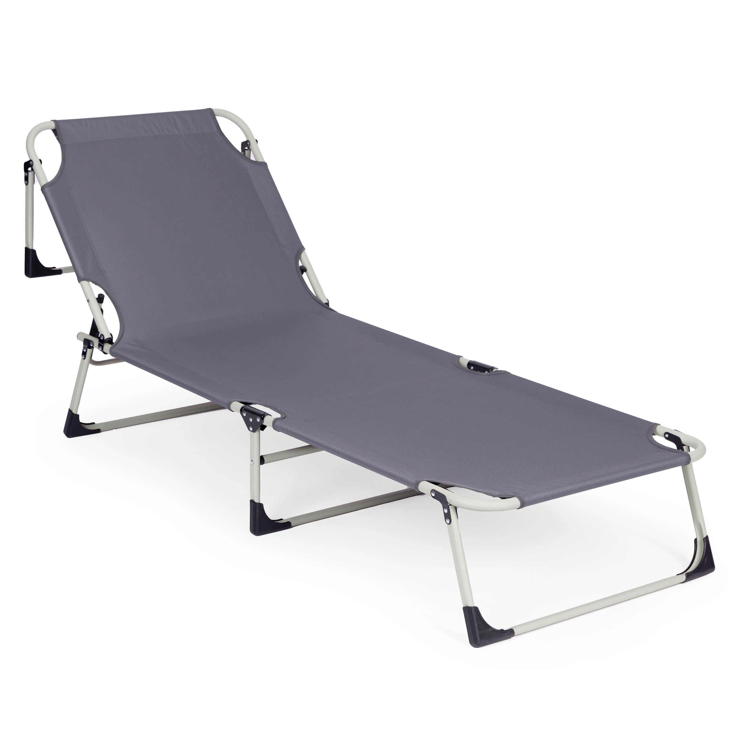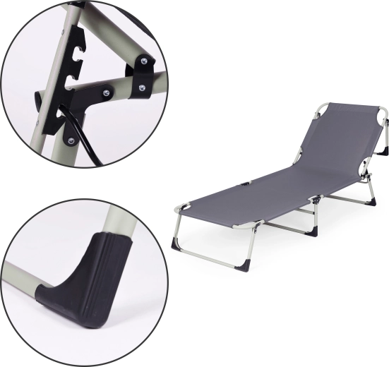 Praktisks regulējams atpūtas krēsls universālā pelēkā krāsā ir radīts relaksam pie ūdens, dārzā un ceļā. Biezs polsterēts matracis un noņemams spilventiņš palielina komfortu ilgākas sēdēšanas vai gulēšanas laikā, savukārt 4 leņķos regulējama atzveltne ļauj ātri pāriet no atslābinošas pozas uz pilnīgu guļus stāvokli.