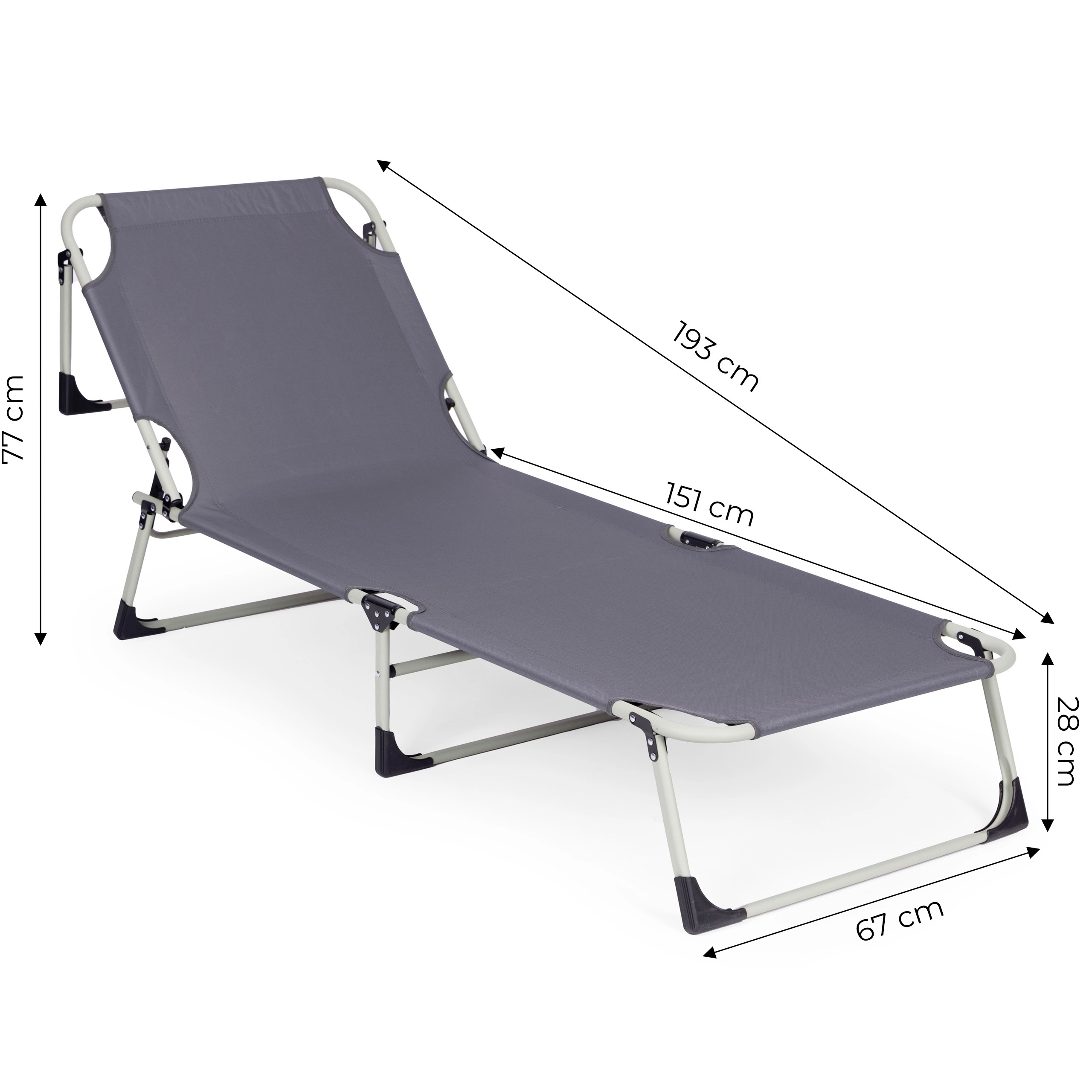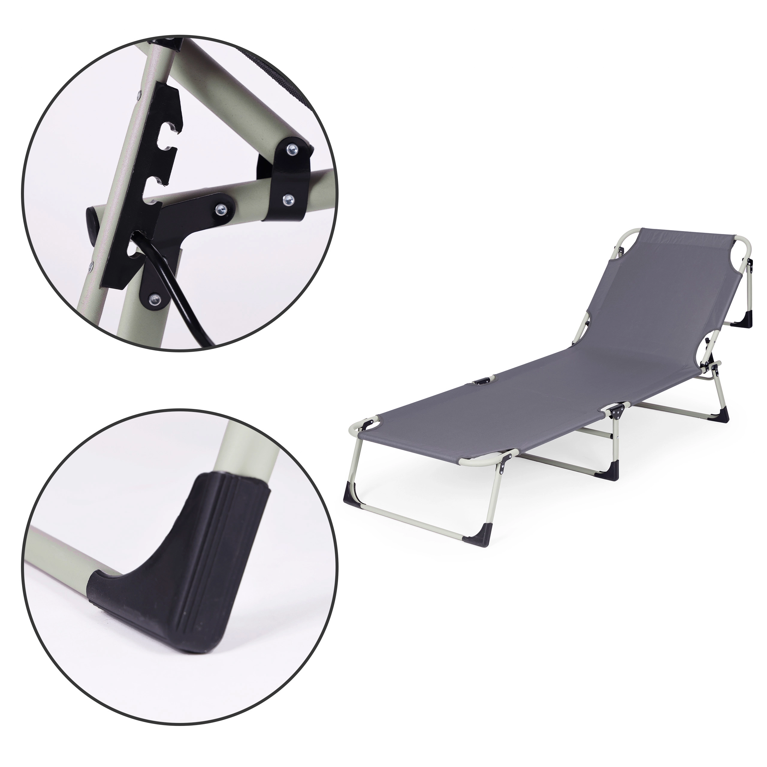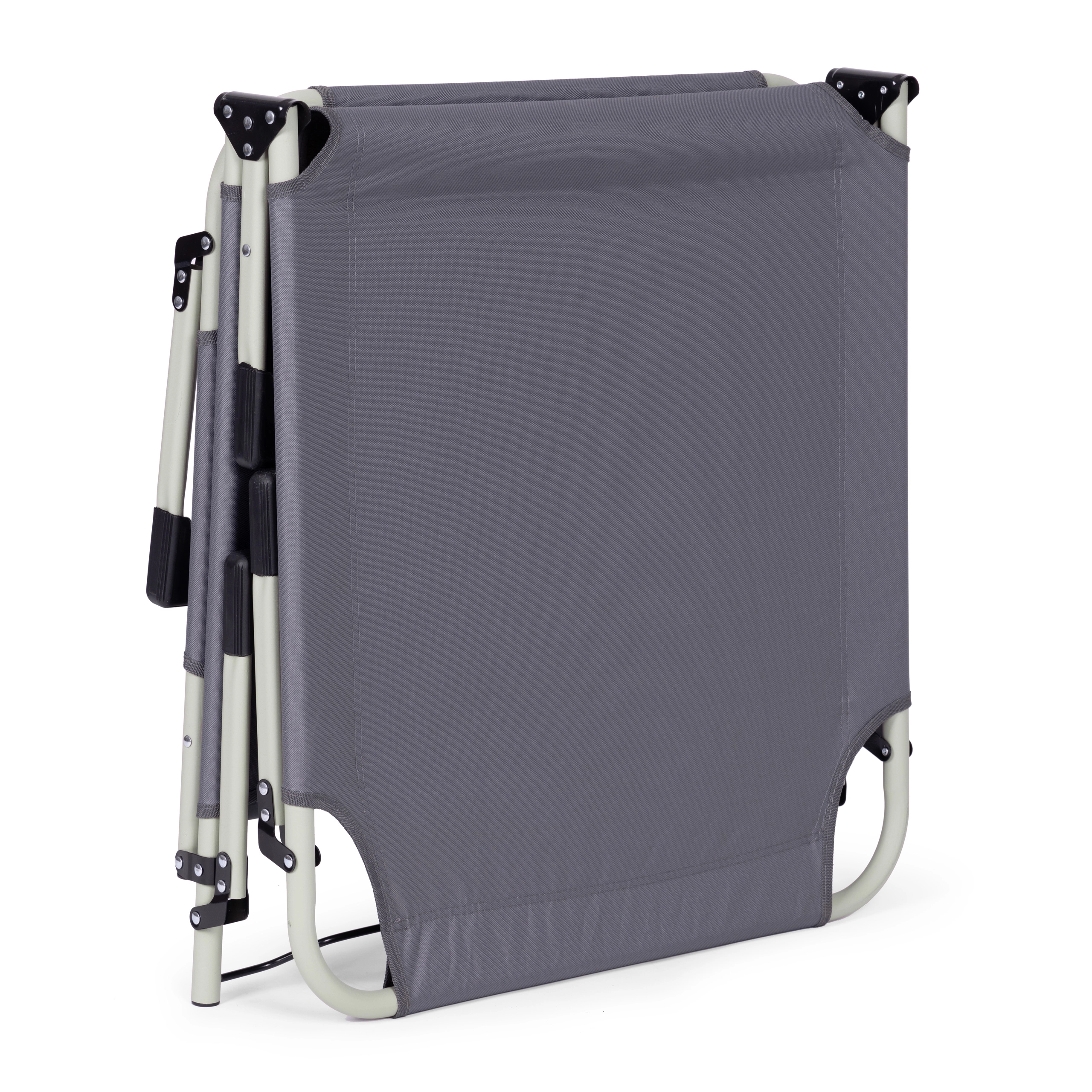 Praktisks regulējams atpūtas krēsls universālā pelēkā krāsā ir radīts relaksam pie ūdens, dārzā un ceļā. Biezs polsterēts matracis un noņemams spilventiņš palielina komfortu ilgākas sēdēšanas vai gulēšanas laikā, savukārt 4 leņķos regulējama atzveltne ļauj ātri pāriet no atslābinošas pozas uz pilnīgu guļus stāvokli.