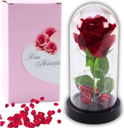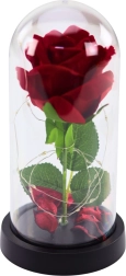 LED apgaismojums maigi izceļ rozes skaistumu un rada siltu atmosfēru, kas ir ideāli piemērota interjera dekorēšanai un romantiskiem mirkļiem. Smalkās rožu ziedlapiņas, kas viegli paceļas kupolā, piešķir visai kompozīcijai eleganci un romantiku.