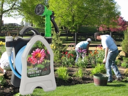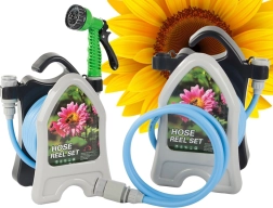 Praktisks statīvs ar āķi taupa vietu, atvieglo pārnēsāšanu un ļauj ātri uztīt šļūteni bez mezgliem.