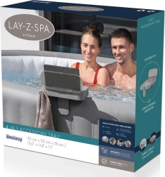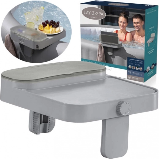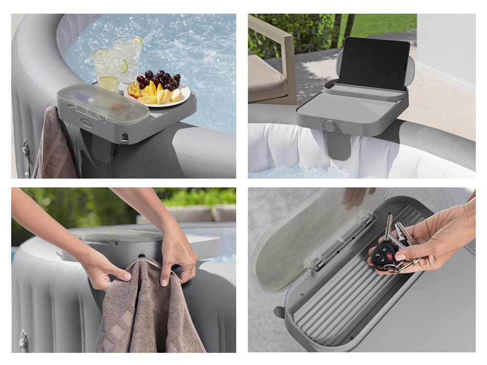 Izbaudiet relaksu burbuļvannā bez kompromisiem – daudzfunkcionālais Bestway 4 vienā plaukts visiem LAY‑Z‑SPA modeļiem vienmēr noturēs pa rokai dzērienus, tālruni, planšeti un sīkumus. Tas piedāvā galdiņu, pret šļakatām izturīgu nodalījumu, dvieļu pakaramo un planšetes turētāju vienā. Pateicoties regulējamām žokļveida skavām (5–25 mm), to var ātri un stabili piestiprināt pie burbuļvannas malas.