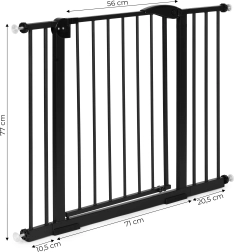Regulējams platums 74–105 cm viegli pielāgojas lielākajai daļai atvērumu mājoklī. Iekļautie paplašinājumi un spriegošanas skrūves ļauj precīzi noregulēt. Vārti ir piemēroti ne tikai mazu bērnu vecākiem, bet arī suņu un kaķu saimniekiem, kuriem nepieciešams droši norobežot telpas.